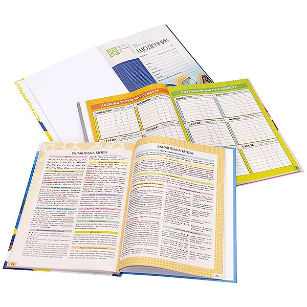 Школьный дневник формата B5 "Украина Киев" в твердой обложке. В начальной части дневника расположены страницы для указания данных ученика (ФИО, группа крови, домашний адрес, электронный адрес, телефон) . Также в начале расположены таблицы для записи данных о учителях, одноклассниках с телефонами и адресами, а также расписание уроков. На последних страницах напечатаны правила правописания украинского языка, основные формулы и правила алгебры, химии (с таблицей Менделеева), геометрии, физики. Язык оформления украинский, размер 24,5х17см.
